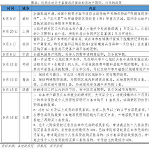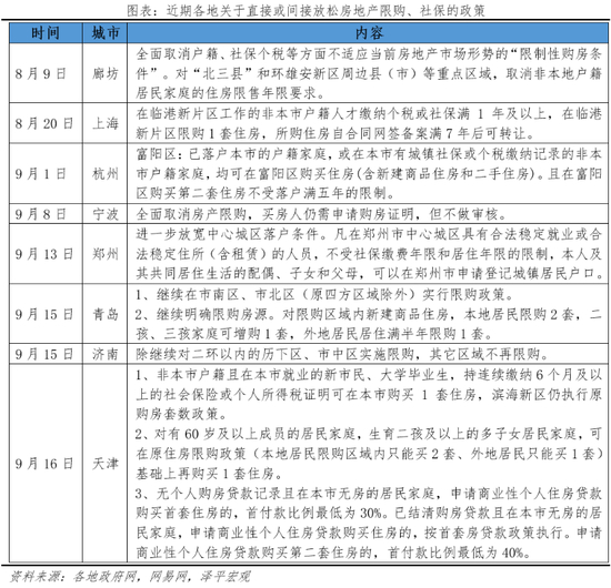 9月16日,天津非本市户籍购房,社保年限从2年缩短为6个月,且二套首付降低为40%。9月15日,济南除了历下区、市中区区域实施限购外,其他区域或二环外不再限购。9月1日,杭州的富阳区只要已落户本市的户籍家庭,或在本市有城镇社保或个税缴纳记录的非本市户籍家庭,均可在富阳区购买住房(含新建商品住房和二手住房),且在富阳区购买第二套住房不受落户满五年的限制。