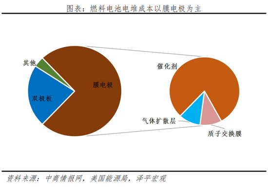 电堆是燃料电池系统最核心的部分,成本占燃料电池成本的59%。电堆主要由多层膜电极、双极板堆叠而成,其中膜电极是燃料电池中多项物质传输和发生电化学反应的场所,由质子交换膜、催化剂与气体扩散层组成,占燃料电池电堆成本的65%,是其核心部件。
