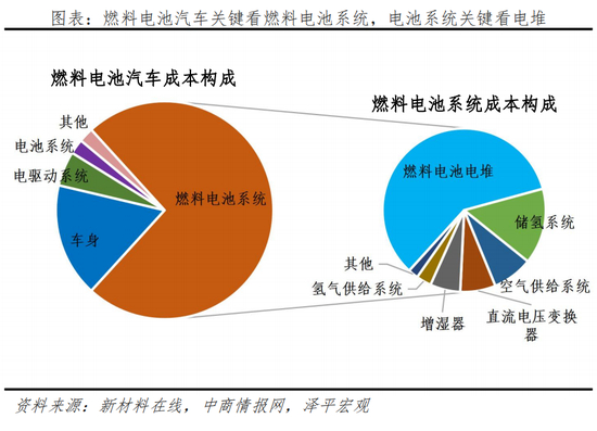 氢燃料电池汽车的成本结构与锂电池汽车相似,不过燃料电池系统组成更加复杂。总结一句话,燃料电池技术主要看电堆,电堆关键看膜电极。