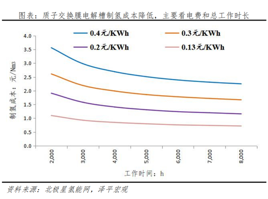 随着氢能源产业链商业模式逐步成熟,氢气需求的增加将不断提升质子交换膜电解槽的工作时长,会进一步实现质子交换膜电解槽成本的下降,叠加可再生能源电力成本的下降,最终质子交换膜电解槽制氢技术的成本会低于碱性电解槽。