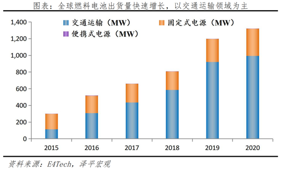 近年来氢燃料电池的出货量主要集中在交通运输、便携式发电和固定发电站等新能源领域,其中交通运输领域为燃料电池下游重点应用环节,未来大有可为。
