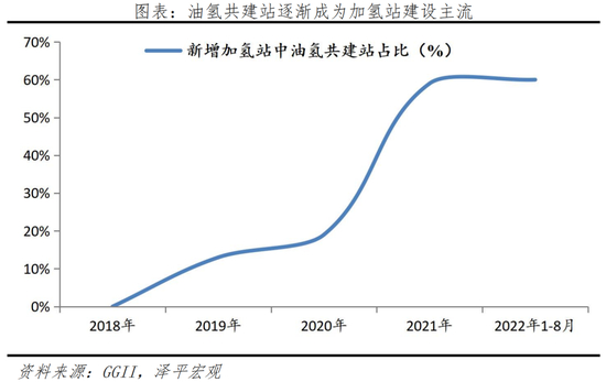 鉴于加氢站建设和运营的经济性是制约产业发展的关键因素,因此油氢合建站是满足未来相当长时间内油、氢燃料电池车共存期能源补给的最佳方式。目前我国油氢共建站建设加速,根据GGII数据,在我国加氢站新增量中,合建站的占比近年来迅速上升。2022年的1-8月,占比高达60%以上,已经成为加氢站建设主流。