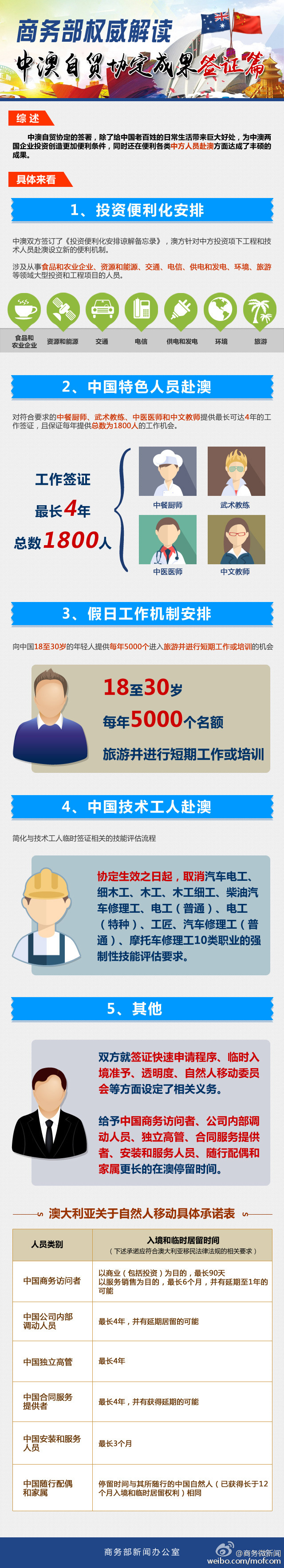 为了让广大网民更好地了解中澳自贸协定内容,商务部新闻办公室特别推出了货物贸易、签证、服务贸易、双边投资四个篇章的图片和文字介绍,首次对中澳自贸协定成果进行独家权威解读。本篇为签证篇,大家快点看起来吧: