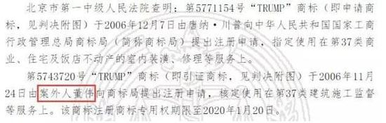 上述信息来源于每日经济新闻(微信号:nbdnews)获悉的一份编号为“(2015)高行(知)终字第345号”的《唐纳.川普与中华人民共和国国家工商行政管理总局商标评审委员会其他二审行政判决书》(以下简称“判决书”)。