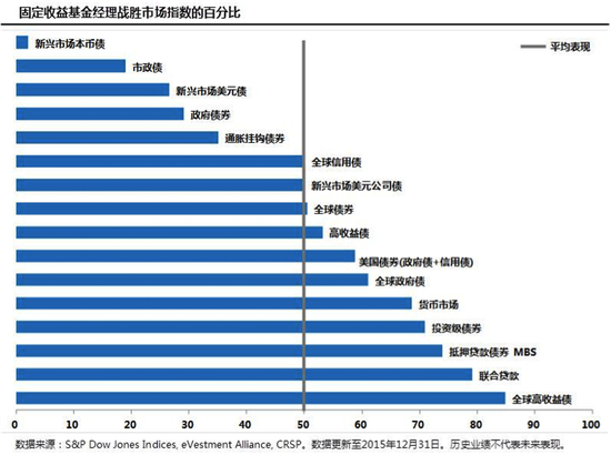 二是ETF推广者的经验往往集中在股票投资上,债券市场是否有相同的规律?标普道琼斯指数公司发现以五年投资期来衡量,债券市场上主动型和被动型基金表现按资产类别划分基本平分秋色。下图显示前者的优势由低到高主要体现在全球债券、高收益债、美国政府债和信用债、全球政府债、货币市场、投资级债券、抵押贷款 债券、联合贷款、全球高收益债。后者的优势主要体现在在新兴市场债、美国市政债、通胀挂钩债券等。如果不了解这些规律,把股票市场上的经验在债券市场进行盲目推广,就会弄巧成拙了。