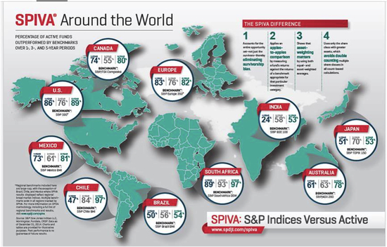 标普道琼斯指数公司2016年7月的报告显示,五年内战胜指数比例超过50%的股票主动型基金,由低到高分别是新兴市场、美国外的国际市场、房地产类股票基 金、国际市场小盘股(比重超过80%)。其他的18个分类,如大盘成长股,小盘价值股等则是被动型指数基金占优(见下图)。