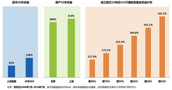 这个研究结果应该说和大多数中国投资者的印象相符合,下图显示2006-2016这十年间,偏股型基金收益分布,可见绝大多数超越了同期股市指数表现,表现最好的10%还跑赢了北京和上海的房价,另外,中国股票基金业绩超过指数的比例在熊市时比牛市时更高。当然,由于追涨杀跌,真正坚持长期投资享受公募基金业绩的投资者并不多。