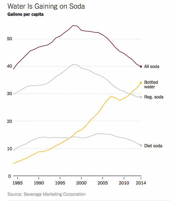 1960年代到1990年代,汽水公司经历过销售量猛涨。而过去二十年里,汽水在美国的销量暴跌了将近25%。而行业调研机构Beverage Digest最新数据显示,美国汽水2016年的销量滑入了近31年来的最低谷,较去年销量又降低了0.8%。