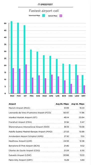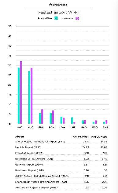 Speedtest网站同样也对欧洲12个最繁忙的机场进行网络测试。结果显示,莫斯科机场以28.18Mbps的WiFi下载速度排名第一。慕尼黑机场以24.23Mbps的下载速度排名第二。法兰克福机场、巴塞罗那机场、希思罗机场等无线网速均未超过6Mbps。阿姆斯特丹机场排名垫底,网速仅为1.93Mpbs。