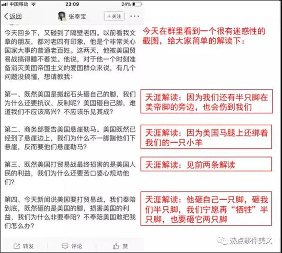 另外,还有一些人在讥讽中国的。比如在朋友圈、微信群里,广泛流传着一个叫张奉宝讥讽中国的段子: