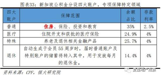 覆盖面极广,是自助型社会保障体系的重要组成。一是覆盖人群广,强制储蓄的要求使得中央公积金覆盖率从1965年的22.1%增至2017年的95.3%,总会员数也从41.8万增至378万;二是保障项目全,分设四大账户、专款专用,广泛覆盖退休、医疗、住房、家庭保护及资产增值等多个领域,截至2017年底,新加坡中央公积金账户合计余额3595.1亿新元,占当年GDP的80.4%,其中普通账户占比35%,特殊、医疗及退休账户分别为25.7%、24.9%和14.4%。