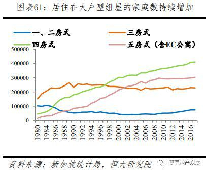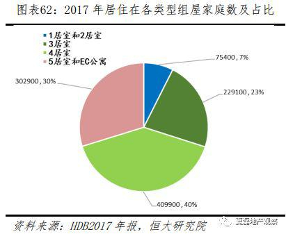 户型多元,目前以大户型组屋为主。普通组屋有一到五房式以及专门为老年人设计的乐龄公寓等多种类型,早期由于政府财力及居民购买力有限,HDB主要以供给小户型(一二三房)组屋为主,满足中低收入家庭基本自住需求。但随着经济的不断发展,人均收入水平大幅上升,保障型的小户型组屋逐渐减少,改善型大户型大幅增加。截至2017年底,大户型组屋(四、五房式)合计占比高达70%,而1房式组屋和乐龄公寓(Studio Apartment)等小户型已从购房市场淘汰,目前主要用作租赁。不同类型的组屋均有较完整的生活配套设施,只在面积、卧室数量等方面存在差异,不会产生“贫富分区”的感觉,从而有效保障了不同层次中低收入群体的住房需求。