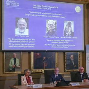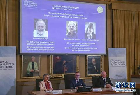 ▲10月2日,瑞典皇家科学院公布2018年诺贝尔物理学奖获得者。图片来自新华社