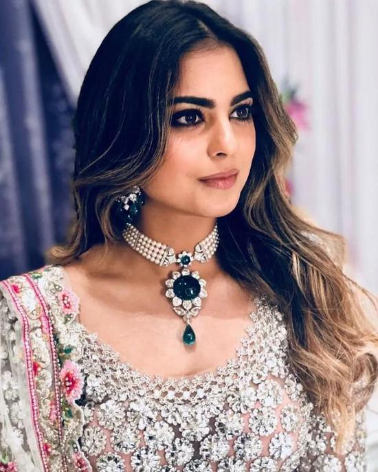 Isha穿着印度传统的lehenga,全手工绘制,刺绣,身上带着未切割的钻石和赞比亚绿宝石,整个行头价值上亿。