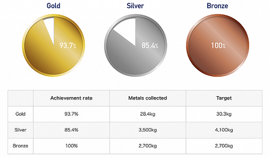 2月8日,东京奥组委官员表示,该活动很快将能完全满足明年夏季所需5000枚奖牌的金属量。2018年6月,铜牌的收集量就已完成目标,同年10月,已收集到银所需数量的85.4%和金所需数量的93.7%。按照进度,活动预计会在3月31日结束。