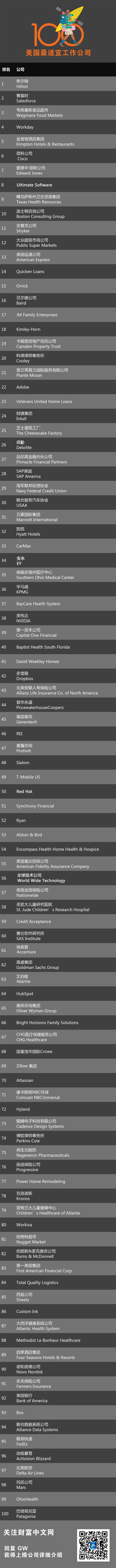 这是《财富》杂志第22次“美国最适宜工作的100家公司”榜单。《财富》杂志的研究伙伴Great Place to Work对今年的候选公司从公司福利到创新机会进行了全面评估。名列前茅的公司都十分重视从全体员工那里获取创意。在最新榜单上,希尔顿从第33位跃居榜首,赛富时、韦格曼斯食品超市分列二、三名。