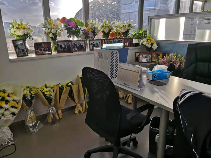 北京,金也淘的工位上被摆放了用于悼念的菊花。 新京报记者 倪兆中 摄