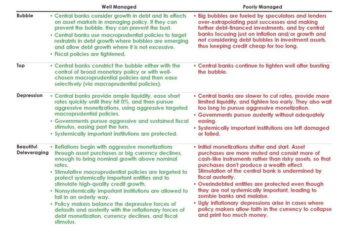 我们认为在债务泡沫,资产价格顶部,去杠杆和经济衰退中,管理层都有不可推卸的责任。好的管理和差的管理差别很大。在泡沫阶段,好的管理会将债务增长作为目标,财政政策开始收紧,来管理债务的泡沫。坏的管理会被市场投资者驱动,管理层仅仅看到通胀和经济增长,导致流动性长期以很便宜的价格出现。在债务周期顶部的时候,好的管理通过货币政策,微观流动性操作来缓和泡沫的顶部。而糟糕的管理就是不断收紧收紧再收紧,刺破泡沫。在经济萧条中,好的管理是杨浩提供足够多的流动性,推动充裕的流动性,将短期利率迅速降低到0%。而糟糕的管理是缓慢降低,提供有限的流动性,过早的收紧。在去杠杆阶段,好的管理会快速的货币化,资产的收购以及货币的贬值,将名义增速带动利率水平之上。而糟糕的管理则是几乎没有资产的收购,并没有基于财富效应做任何的动作。