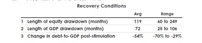 最后一点,我们看看整个债务危机中,从经济萧条到恢复正常需要花多少时间。历史上看,通常需要5到10年的时间,让经济恢复到前期高点。而对于股票来说,需要更长的时间,差不多10年时间,让股票价格回到前期的高点。下面是我们研究案例中平均股票回调时间在119个月。经济平均回调时间在72个月!