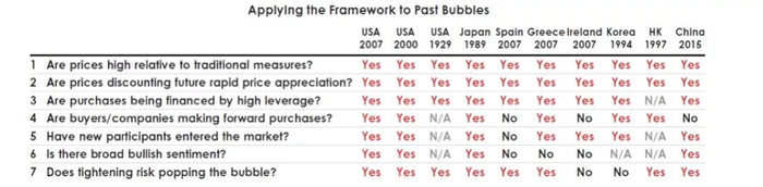 那么判断一个泡沫有什么标准码?下面是我们对于过去几次泡沫研究后,列出的统一标准。这里面有7个标准:价格相对历史平均是不是过高,价格是不是包含了未来快速升值,购买是不是通过高杠杆完成的,购买者是不是在未来防止未来价格继续上涨做一些套期保值,是不是有新的参与者进入市场,是不是有全面牛市的情绪,收紧是不是会刺破泡沫。
