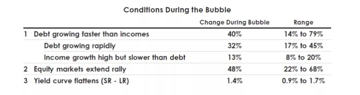 下面这张图是泡沫发生的一些条件。我们看到债务增长超过了收入增速,股票市场出现上涨,国债收益率下降。
