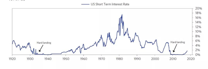 1. 通缩型衰退。在这种情况下政策制定者会将利率下调到0。但是无法再往下降利率了,这时候债务重组和紧缩还是登台。在这种情况下债务上限上升,因为收入下滑速度超过了债务重组速度。这种情况主要在债务大量是本地化货币的背景。
