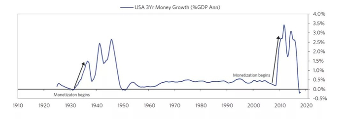 如何管理经济萧条?前面我们提过,管理层有四个选择:紧缩,债务重组,债务货币化或者印钞,财富再分配。每一个选择对于经济的影响都不同,关键是如何把这些选择做好。很多时候,管理层会做出错误的选择。在一开始政府是不愿意出手的,这将导致经济萧条更加严重。2008年美国金融危机,政府出手很快,导致经济萧条时间很短。但是1930年美国大萧条和80年代日本失落的十年,政府出手很慢,导致了很长时间的萧条。从具体案例的角度看,我们看到下图美国政府在1930年大萧条印钞程度和2008年印钞程度。明显2008年以更快的速度向市场注入流动性,吸取了1930年的教训。
