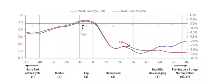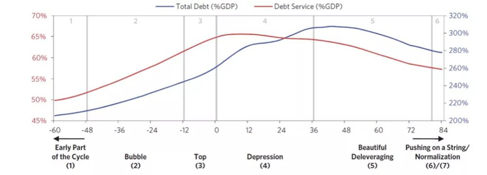 下面这张图展示了一个长期债务周期的七个部分。我们接下来会一个个和大家分析。