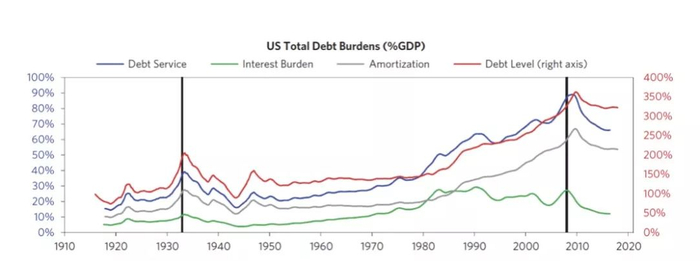 下面这张图是美国1910年以来的债务和债务上限。你会发现利息支付很平稳,而债务不断向上。所以债务成本的上升幅度没有债务上升的幅度那么大。这是因为美联储不断降低利率水平,维持债务融资的持续扩张,直到有一天他们什么都不能做了(利率降低到0)。当这一天来临时,去杠杆就开始了。