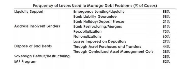 关于债务重组,我们也会看到有几种做法。一种是提供流动性,包括银行流动性,紧急借贷。一种是解决放款人的债务问题,包括债务的重组,重新资产化,债务国有化。一种是如何剥离掉债务,包括成立资产管理公司来吸收这些债务(中国在90年代曾经成立四大资产管理公司来吸收银行的坏账)。最后一种是主权违约和重组。下面这张图我们看到在48个案例中,这些做法和工具的使用比例。最常用的还是流动性管理工具,提供紧急贷款和流动性。债务重组合并,债务的国有化也是被经常用到的。我们在2008年金融危机看到美国银行的国有化,其实也是一种常见的做法。