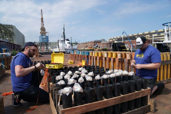 5月25日,工作人员在美国宾夕法尼亚州费城一处码头安装产自中国湖南浏阳的烟花,为当晚美国阵亡将士纪念日的烟花表演做准备。(刘杰 摄)