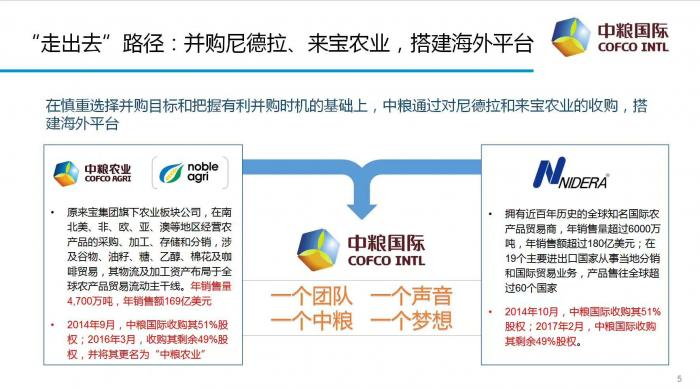 中粮集团通过对来宝农业(NOBLE AGRI)和尼德拉(NIDERA)的收购,搭建了走出去的海外平台。