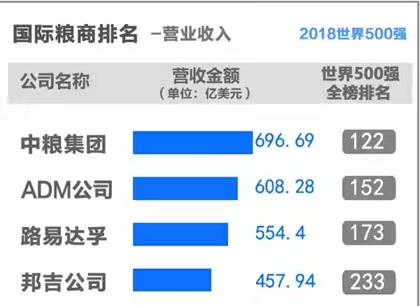 “经过几代中粮人的奋斗,我们终于实现了成为国际化大粮商的梦想,这是一条充满挑战与艰辛的路途,”许冠华说。在2018年《财富》世界500强的名单中,中粮从2017年的136位跃升到2018年的第 122 名,而四大粮商中的其他四家,除去Cargill没有参与,其他三家ADM 排名第152位、LDC排名173位、Bunge排名第233位。
