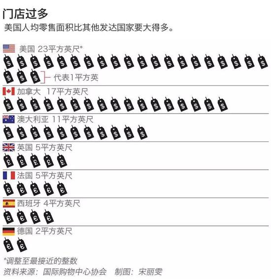 华尔街投行Jefferies分析师兰德尔·柯尼克(Randal Konik)说,美国有大约1350家封闭式商场,但实际上只需要200到400个。根据国际购物中心协会的数据,包括购物中心等零售场所在内,美国截至去年的人均门店面积为23平方英尺,在全世界遥遥领先。英国为5平方英尺,西班牙4平方英尺,德国两平方英尺。专门研究门店连锁的科尔尼管理咨询公司(A.T. Kearney)合伙人麦克尔·布朗(Michael Brown)说,从历史上看,欧洲的城市规划者们谨慎地限制了零售空间与人口的比例,而美国则采取了更达尔文主义的方法。在亚洲大部分地区,受欢迎的品牌连锁店都是在电子商务时代创立的,所以很多都属于“数字原生代”。