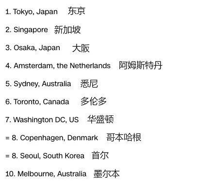 从总排名来看,前10名中,亚洲城市占据4席。日本东京连续第三年蝉联第一,新加坡作为城邦国家位列第二,日本大阪名列第三,韩国首尔排名第八。