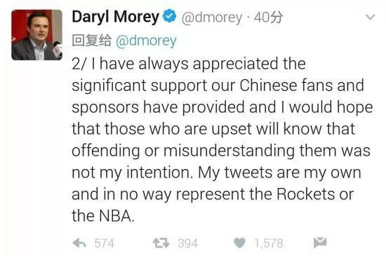 我一直都对中国球迷和赞助商给予的大力支持非常感激,我希望那些气愤的人知道,冒犯他们或误解他们并不是我的本意。推特是我自己的,绝对不代表火箭或NBA。