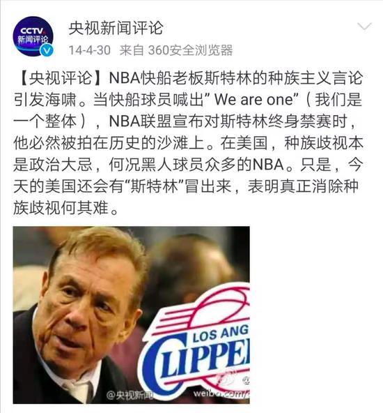 2014年,当时的快船队老板斯特林与女友一段录音被曝光,涉及种族歧视言论。