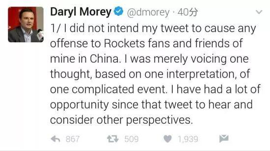 我无意在推特上冒犯中国的火箭球迷和朋友们,我只是表达一个想法,对一个复杂的事件提出了一个看法。在发布那条推特之后,我有了很多机会听取和考虑其他的观点。