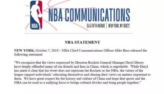 “我们对休斯敦火箭队总经理达瑞尔·莫雷发表的不当言论感到极其失望,他无疑已经严重地伤害了中国球迷的感情。莫雷现已澄清他的言论不代表火箭队和NBA的立场。在NBA的价值观下,人们可对感兴趣的事情深入了解并分享自己的看法。我们极其尊重中国的历史与文化,希望体育和NBA作为一股团结的正能量,继续为国际文化交流搭建桥梁,将人们凝聚在一起。”