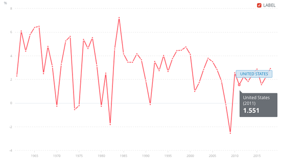 美国1961-2018年GDP增长率折线图
