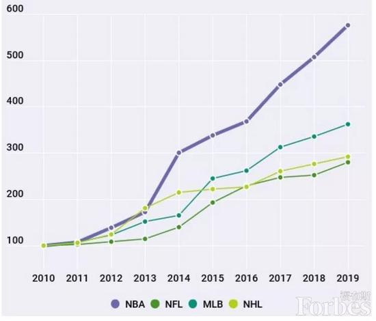 2010年以来,NBA球队平均估值已经增长到了原来的近6倍,增速远高于美国其他三大体育联赛。这要归功于该项联赛的国际发展前景和高额的媒体交易。