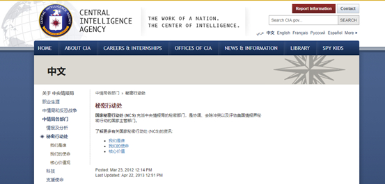 (国家秘密行动处(NCS)充当中央情报局秘密部门,是协调、去除冲突以及评估美国情报界秘密行动的国家主管部门。)