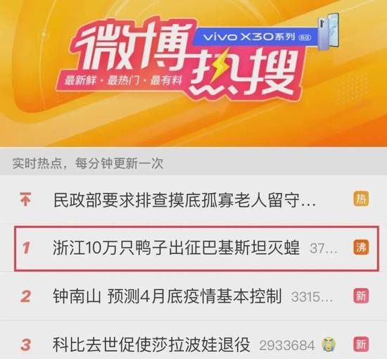 2月27日,话题#浙江10万只鸭子出征巴基斯坦灭蝗#冲上微博热搜第一,引发网友热议。