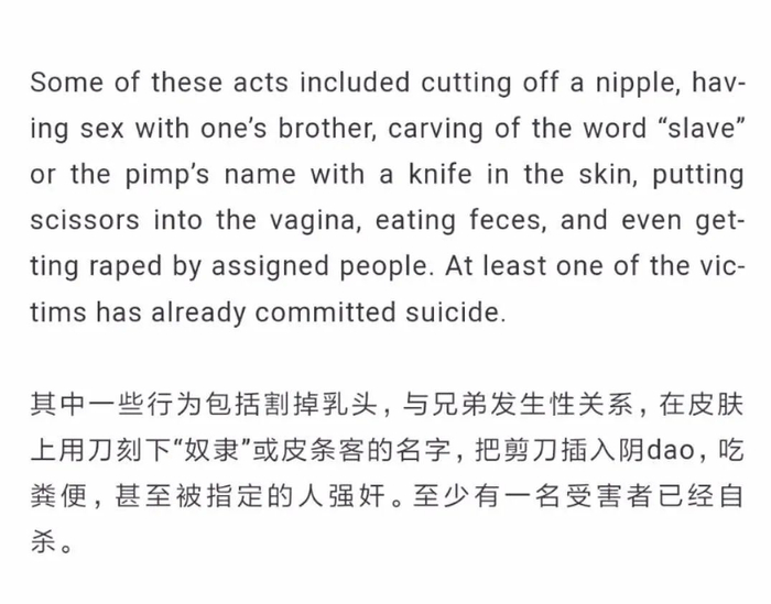 她们被迫做出自残的行为—— 用刀在皮肤上刺上“奴隶”或皮条客的名字,剪掉ru头,和兄弟发生性关系,往下体放剪刀等等。