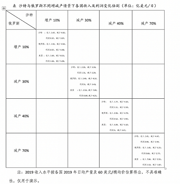 第一场景:沙俄同时选择增产10%,暂时均衡价格在每桶20美元左右,沙俄承担巨额损失。但由于低廉的生产成本,沙特还有利润,但俄罗斯面临全行业亏损。