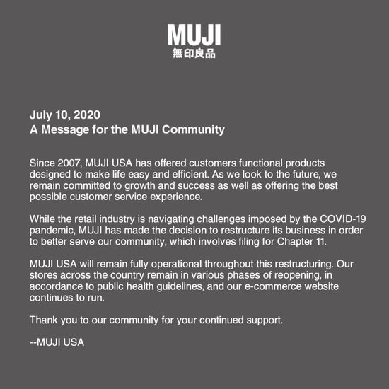 MUJI U.S.A发布的重组通知。
