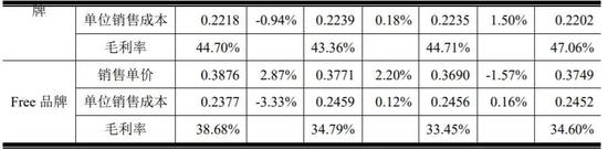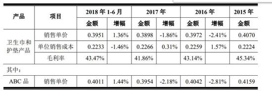 卫生巾品牌ABC与Free所属的广东景兴健康护理实业股份有限公司的招股书显示,2018年上半年,其卫生巾与护垫的销售成本为0.2233元/片,销售单价为0.3951元,毛利率达43.47%。