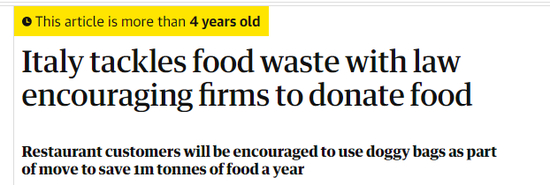 2016年,意大利出台《反食品浪费法》,鼓励企业或农场捐赠食物,号召餐厅向消费者提供打包袋,从而遏制食物浪费的风气。