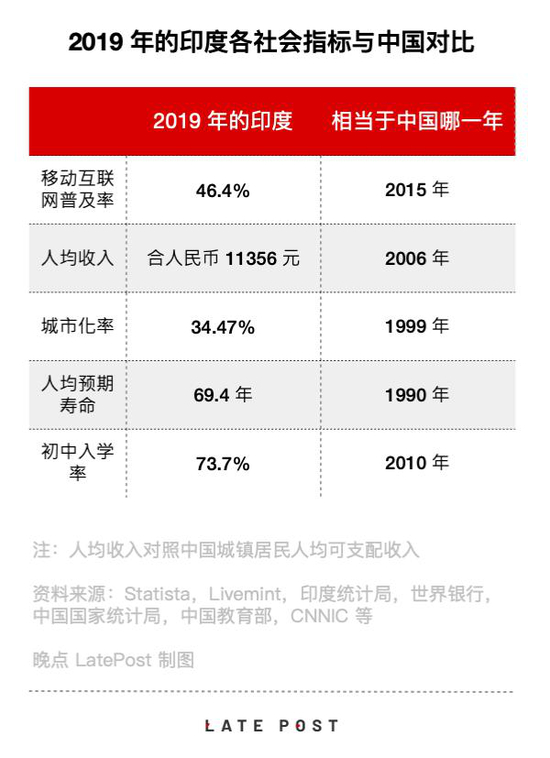 图注:到 2019 年,印度和中国主要指标相聚 4-30 年之间,差距最小的是移动互联网普及率。