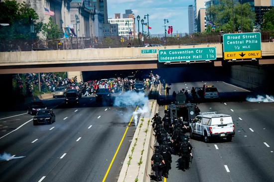 6月1日,美国宾夕法尼亚州费城,抗议明尼阿波利斯市警察执法失当致非裔男子乔治·弗洛伊德死亡的人群与警方发生冲突。图/人民视觉